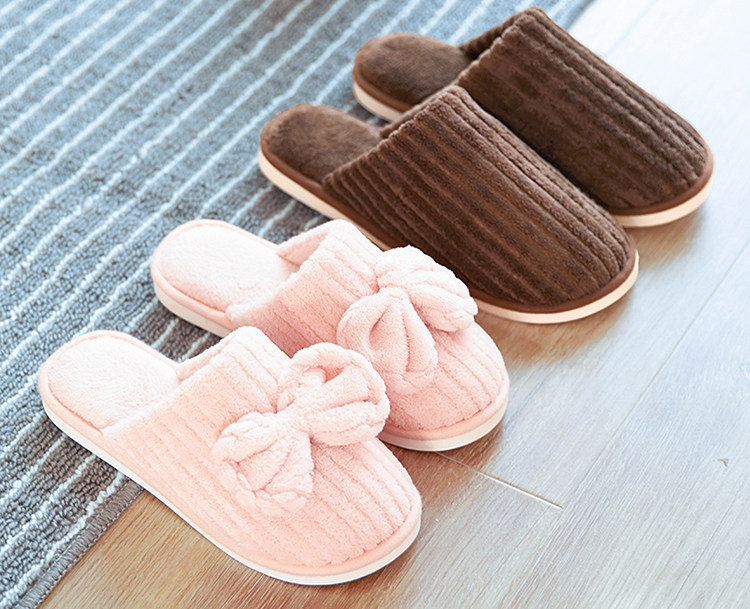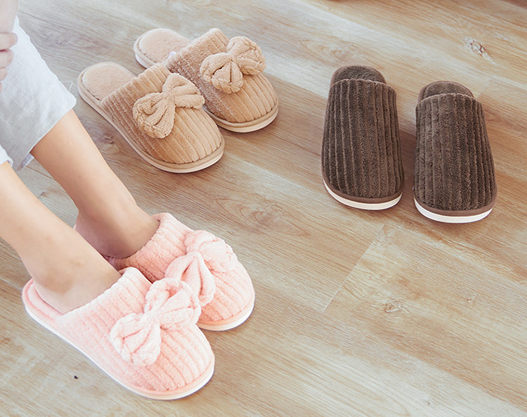 这是一款居家必备的毛绒绒家居棉拖,有男女款,简洁圆润的圆头包头半拖款式,经典百搭的纯色系,每个色都好看,家里人手一色,好区分又有趣。竖条纹的毛绒面料,简约耐看,楦型大方舒适,特别是女款的鞋面上,用同料制作的大大蝴蝶结点缀,很好看又可爱,少女感十足。