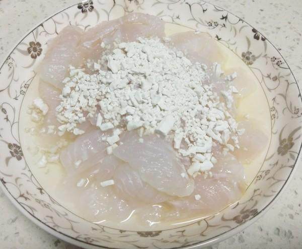 3.巴沙鱼切片,加蛋清芡粉,搅拌均匀。