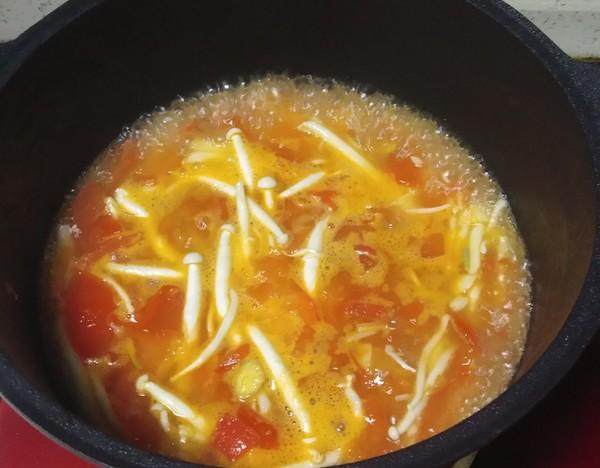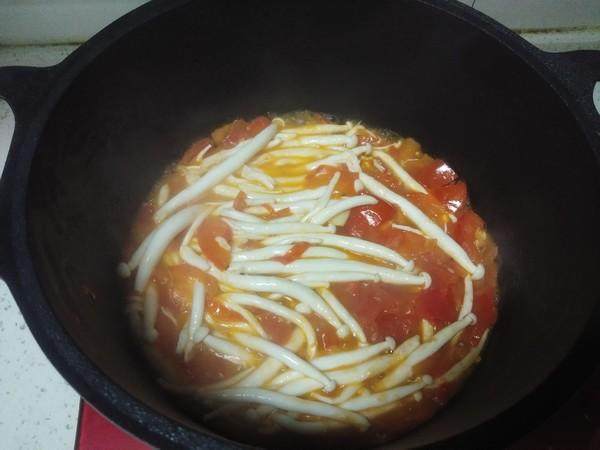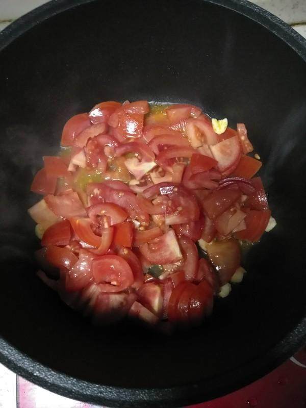 1.油热,西红柿和蒜下锅翻炒,直到西红柿出汁。