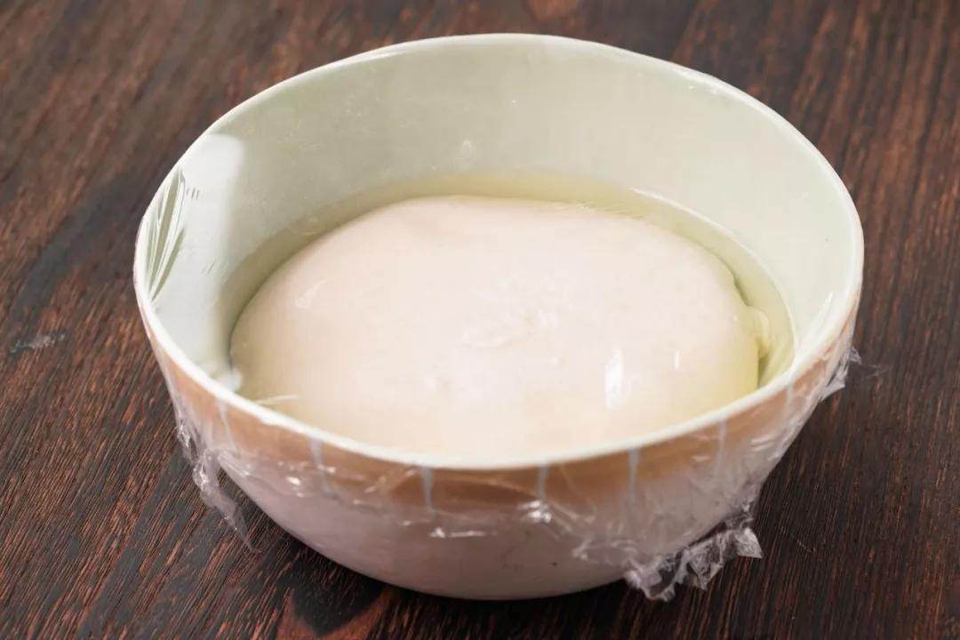 2、揉好的面团表面刷上植物油,盖上保鲜膜室温醒发一晚,口感最佳。