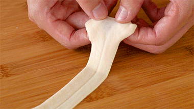 6、最后从筷子印的位置将拉长的面皮撕开。