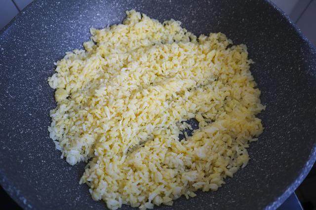 步骤2 锅内放少量的油烧热,加入拌好的米饭炒至粒粒分明后盛出。