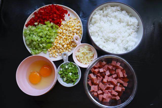 火腿切丁,辣椒去蒂去籽切成丁,玉米脱粒,大蒜小葱切末,鸡蛋打散。(PS:此分量为一人份)