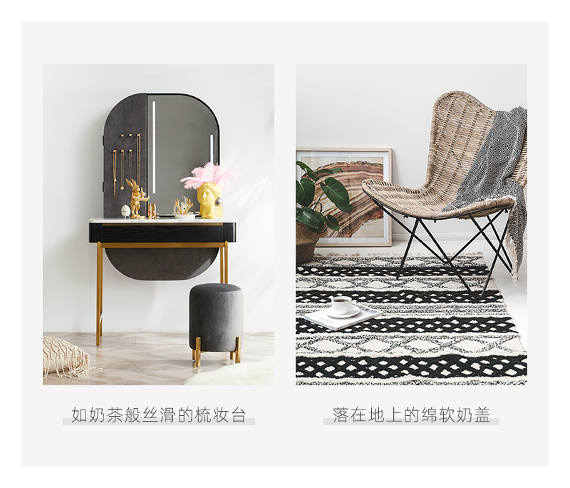 卧室中仅有床品与装饰画未免单调,想要丰富这一杯“甜蜜奶茶”的风味?不如让丝滑的梳妆台与形如奶盖的地毯巧搭配!