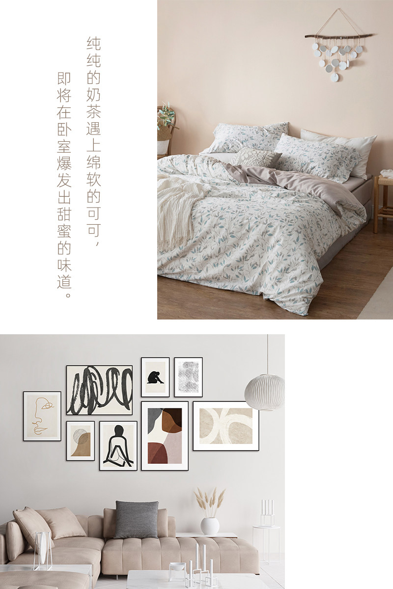 让这样的床品与可可味的装饰画相遇,自带艺术感又不失甜蜜feel的装饰画,不但能为墙面添彩,为着奶茶味的双人床加料,也是不在话下。