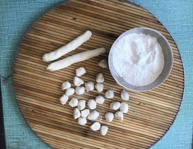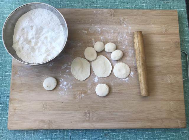 5、醒好的面团搓成长条,然后切成大小一样的小面剂,把分好的面剂擀成薄片;