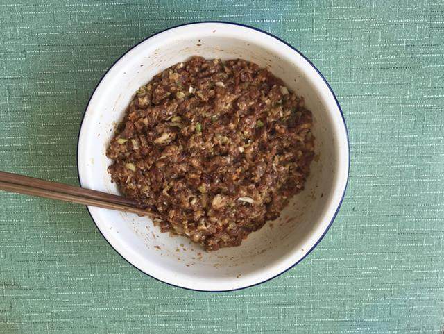 1、先来拌肉馅儿:肉馅里放入葱、生姜末、然后浇上3勺花椒油、炸出香味、接着放入生抽、老抽、蚝油、盐朝一个方向搅拌均匀;