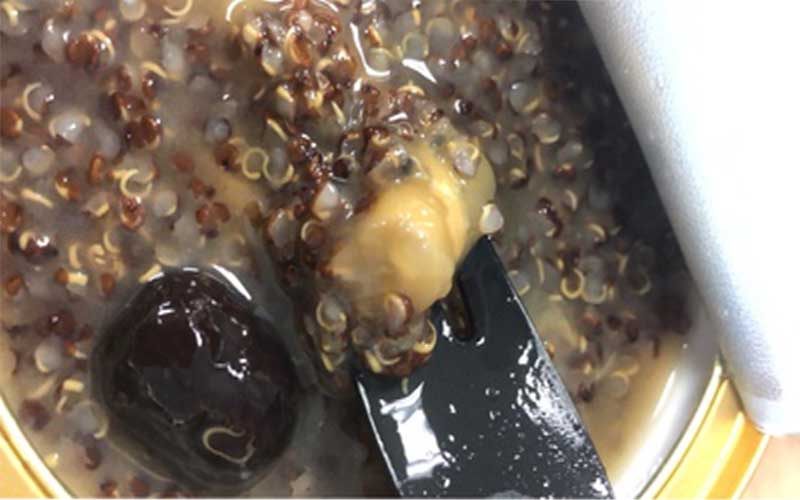 打开是满满的一碗,第一眼看过去有点像八宝粥是咋回事hhhh,藜麦的含量很多把花胶都遮住了 ,挑了一下发现里面的花胶含量还是很多的,能感觉到是炖的非常软烂的那种,尝一口试试味道。