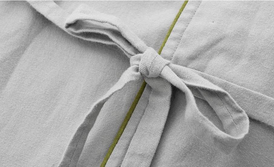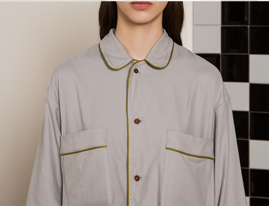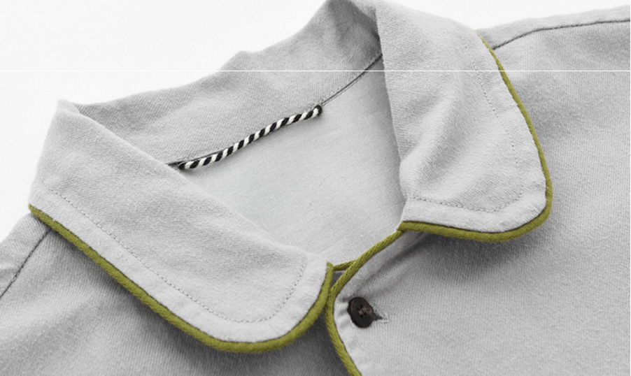连身裙家居服的裙长到小腿位置,在下摆处还做了开叉设计,方便活动,在连身裙的腰部还配有精致腰带。两种款式的家居服都采用复古一片式圆领设计,能扣上翻下,穿着的随意感更强,在衣服的门襟处采用天然牛角扣,在细节处还使用了彩色嵌条工艺,时尚感十足。