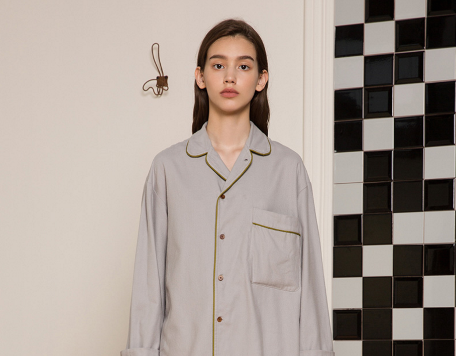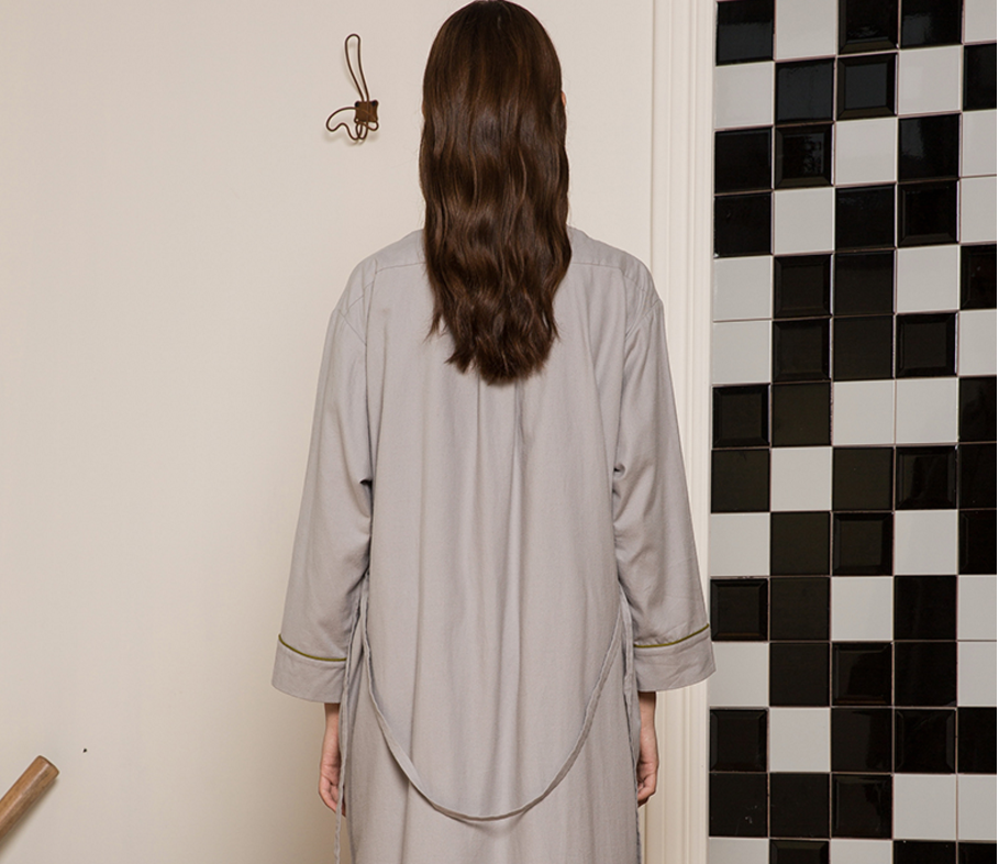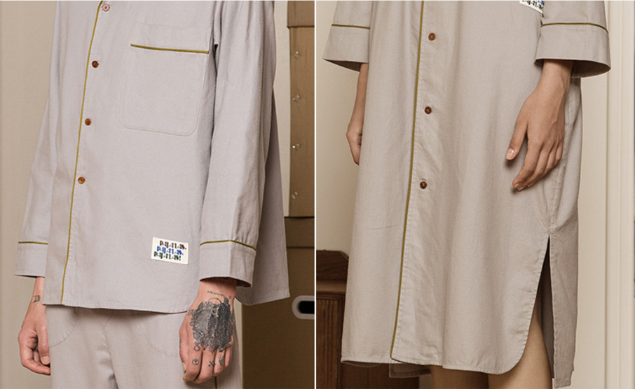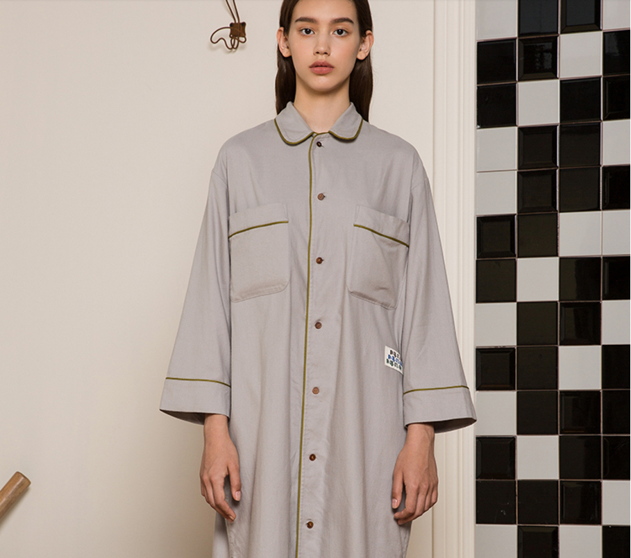 中性的款式设计不管是男女皆可穿着,家居服分为上衣下裤和连身裙两个款式,上衣下裤套装的上衣是衬衫式开襟长袖睡衣,下装是锥裤,整体剪裁松,包容性强。既可以完整一套穿,也可以单穿自由搭配。在下装的裤子腰部,还有前抽绳后松紧的设计,能根据腰围需求作调节,而且在左右两侧还配有大容量口袋,储物方便。