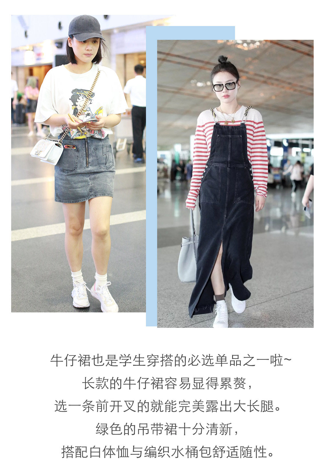 牛仔裙与网纱的混搭已经不再是“异军”,被设计师们强强结合后已经成为新的潮流。A字半身裙可以修饰身形为标准的X型身材,大腿的肉肉在视觉上被自然地淡化了。