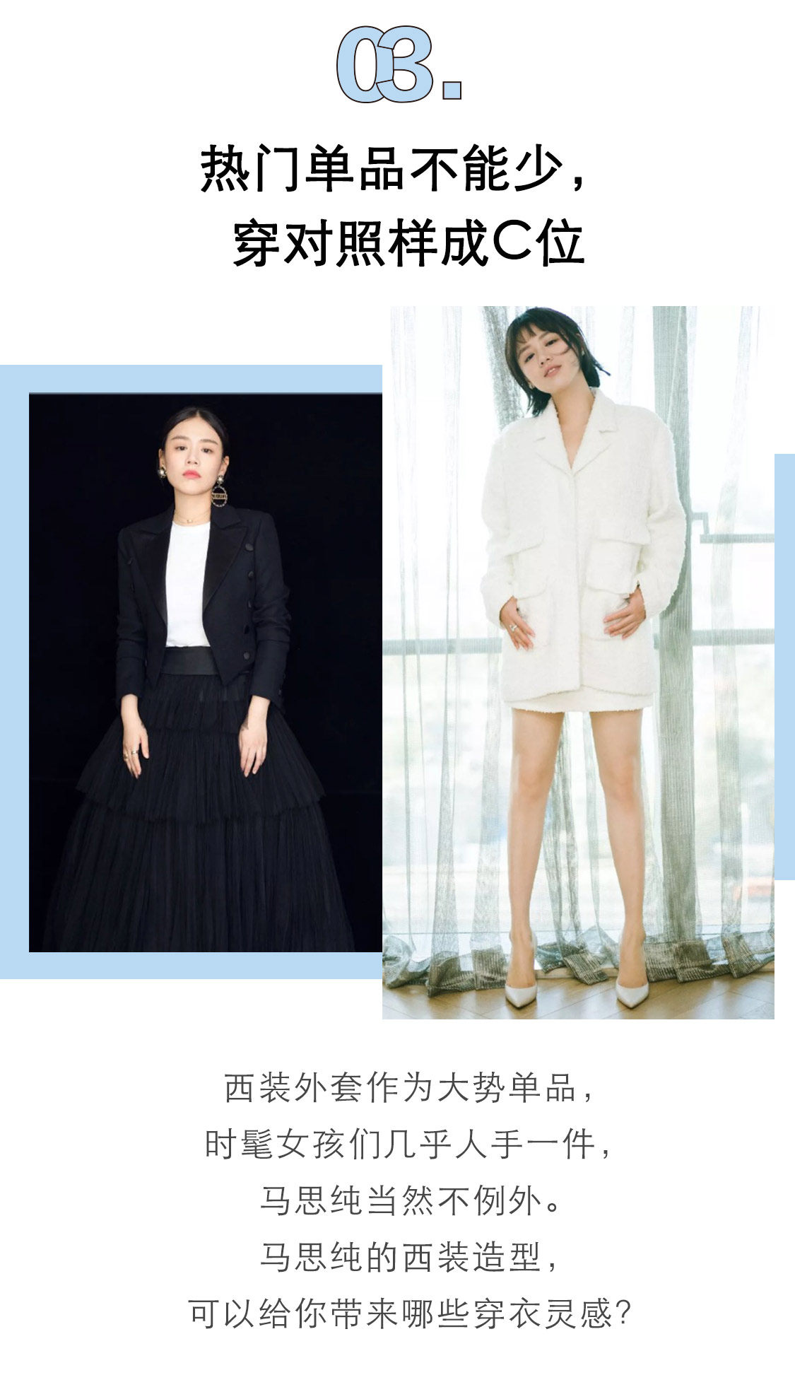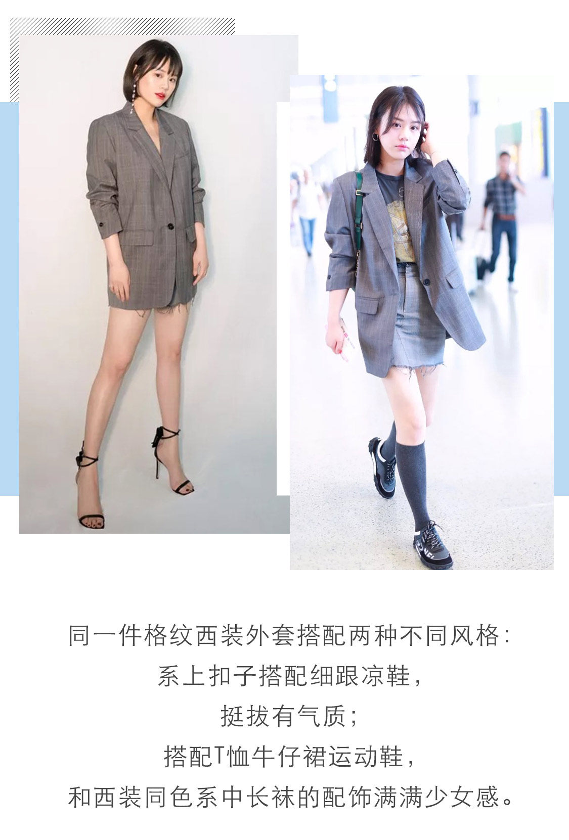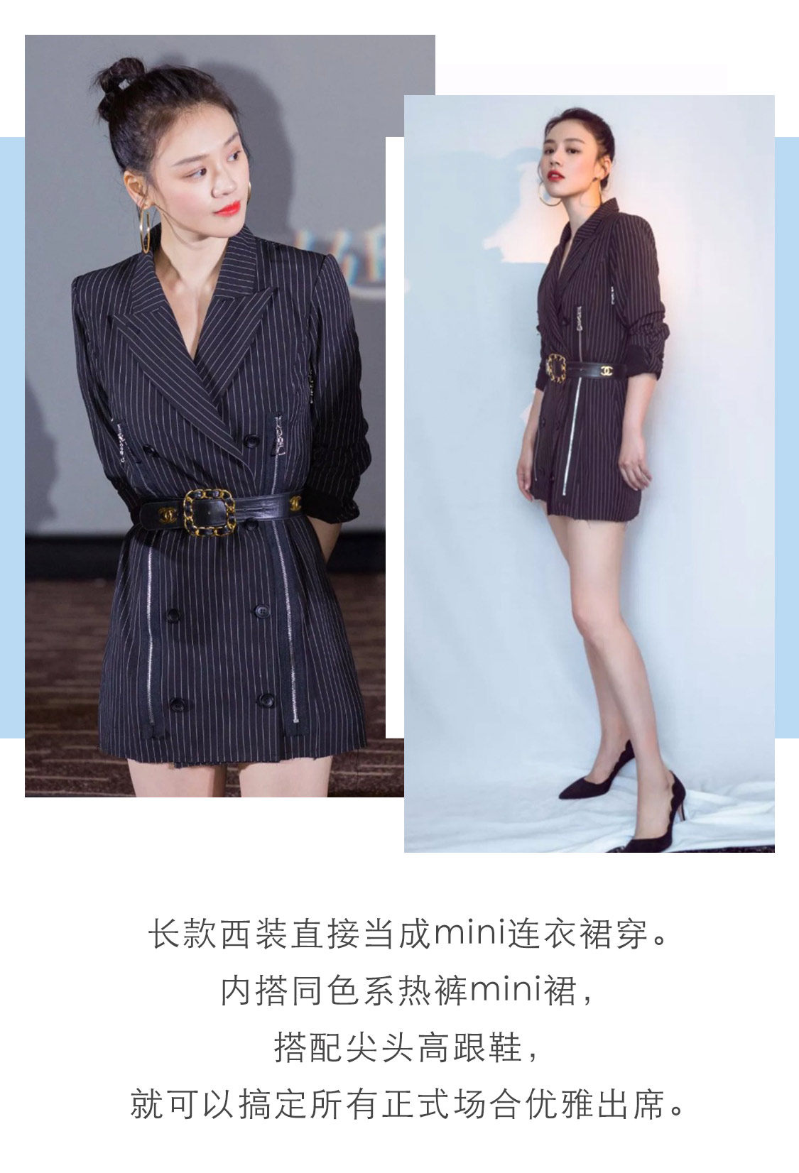 长西服外套本就是显高利器,里面搭配露胃短衬衫+高腰牛仔裤,更是看起来腿长两米,职场精英Girl攻气满满。