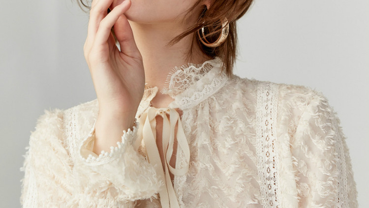 一款蕾丝衬衣,可以让你的整个秋天都变得甜美又浪漫,这款蕾丝衬衣,选用涤纶复合丝面料,手感触感更舒适。领口处的蕾丝领有一种复古的感觉,而丝带领结则为它添加了一份飘逸。衬衣采用了提花剪花工艺,让整件衣衣带有一种毛茸茸的立体感,质感轻盈柔软,上身超级舒适哦!
