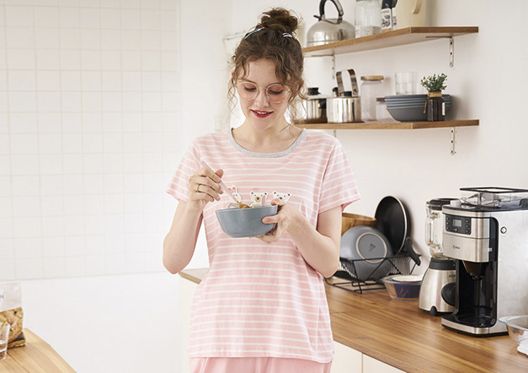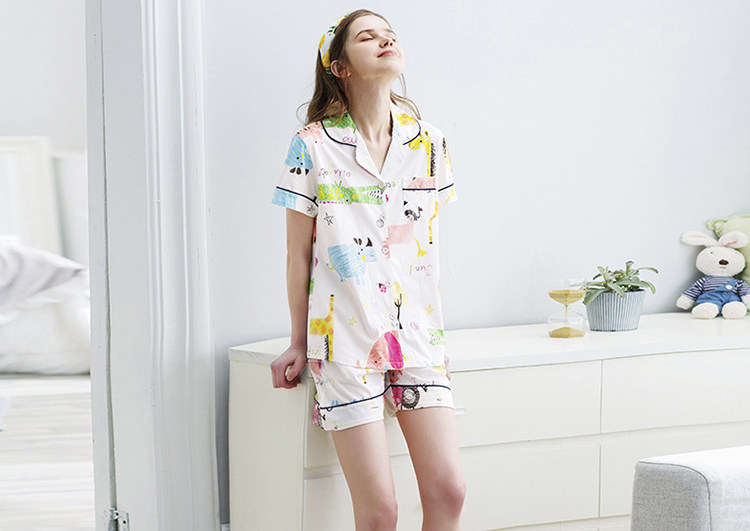 夏天的基础款睡衣,一般都是以T恤的版型为主。这种造型的睡衣套装,上身舒适还自在,加上棉质的面料,简直不要太柔软亲肤,轻松助眠无压力。