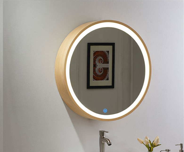 圆形的实木镜子,形状圆润,看起来是很舒服的款式。实木的材质更加结实耐用,因为是优质的实木,在浴室潮湿的环境中使用也不会有问题。推开外层镜子的推门,里面别有一番天地,像是一个小暗室一样,可以用来放置更重日用品。