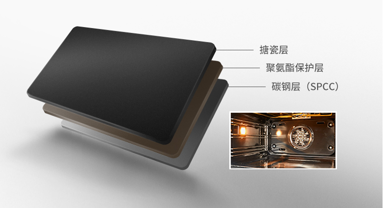 虽然市面上许多蒸烤箱都采用不锈钢内胆,看起来比较光亮,刚粘附不久的油渍很容易擦干净,但使用过的烤箱产品的应该都知道,黏在不锈钢内胆的油渍一旦没有及时擦拭,就再也很难擦干净了。而搪瓷内胆看起来表面光滑致密,很有质感,且具有不粘性,油污油渍一擦即净,十分方便清洁。