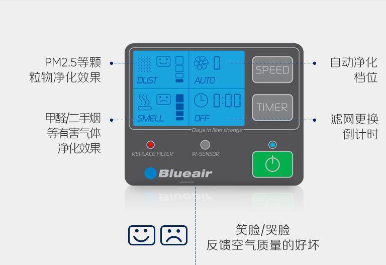 这一款空气净化器的顶部还带有一块儿LED显示屏,上面能够显示当前室内的空气质量如何,并且用哭笑脸来反馈空气质量的情况!最关键的是,它还贴心地设置了一个滤网更换倒计时,这能解决很多人的难题,毕竟我们很多人常常不知道滤网用到什么程度就该换了。除了在LED屏幕上操作,它还配备了一个遥控器。