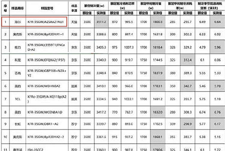 北京消费者协会通过在各种电商平台处采买样品,对市场中16个品牌、25款空调型号进行了全面测试。其中,包括制冷量、制冷消耗功率、中间制冷量、中间制冷消化率和能源消耗效率五个方面,仅有海尔一款空调的制冷量超过了额定值。