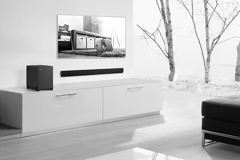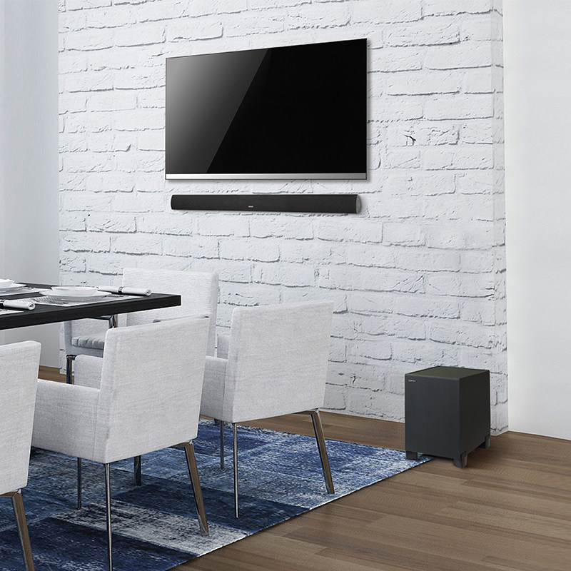 天龙回音壁电视音响时尚精致的外形设计,放在室内可以更好的融入家装风格,会让室内看起来更有格调,并且音响只有5cm的厚度,不仅可以挂墙摆放还可以平面摆放,带来多样使用体验,此外搭载的遥控器一键就可以切换多种场景,保证使用时候的便利,让你在家尽情享受影院级观影体验。