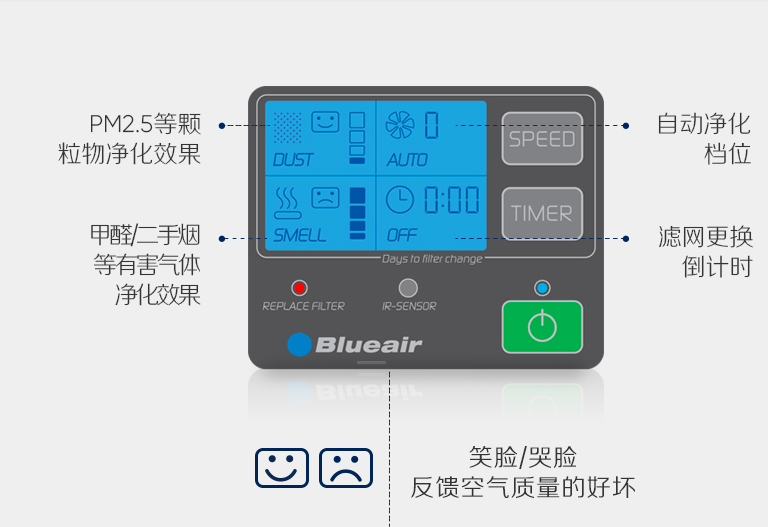 除了优秀的净化效果,它的设计也非常人性化。首先,它是一台支持遥控操作的空气净化器。其次,它在顶部设计了一个LED显示屏,它可以明确的显示出室内颗粒物与甲醛等污染物的净化效果。