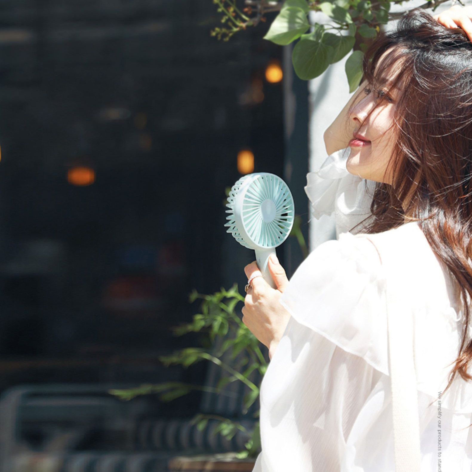 这款简约的手持风扇,底部有底座,可以放置在底座上,可以提高高度。搭配2000mAh的电池,充电90分钟,便携容易携带。七叶风扇叶设计,风吹的更柔,不会太直冲皮肤。马达动平衡的调整,噪音更小。导流风罩,可以让风吹得更远,这样即使你做的离风扇远,也可以在办公桌前,享受到阵阵凉风。