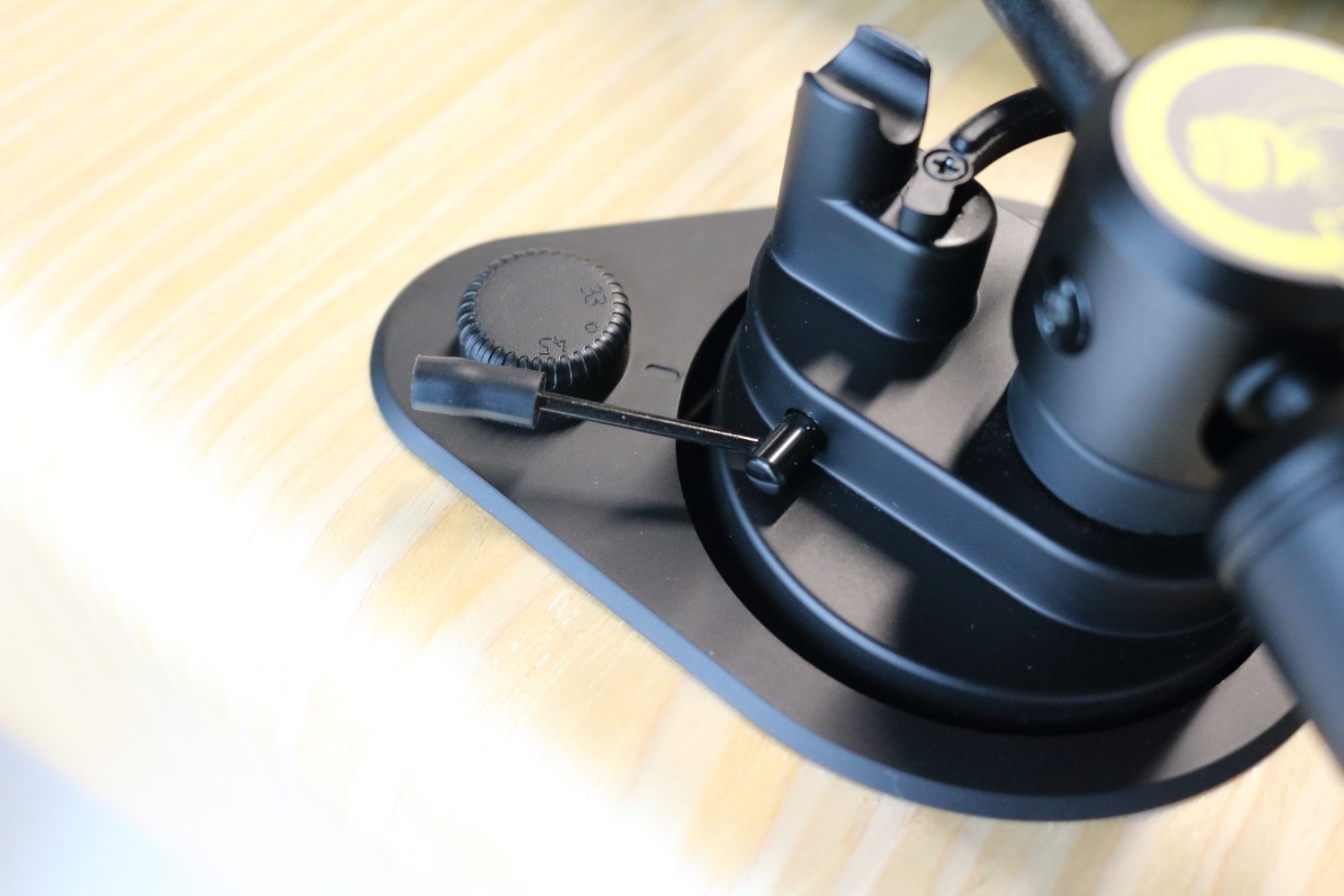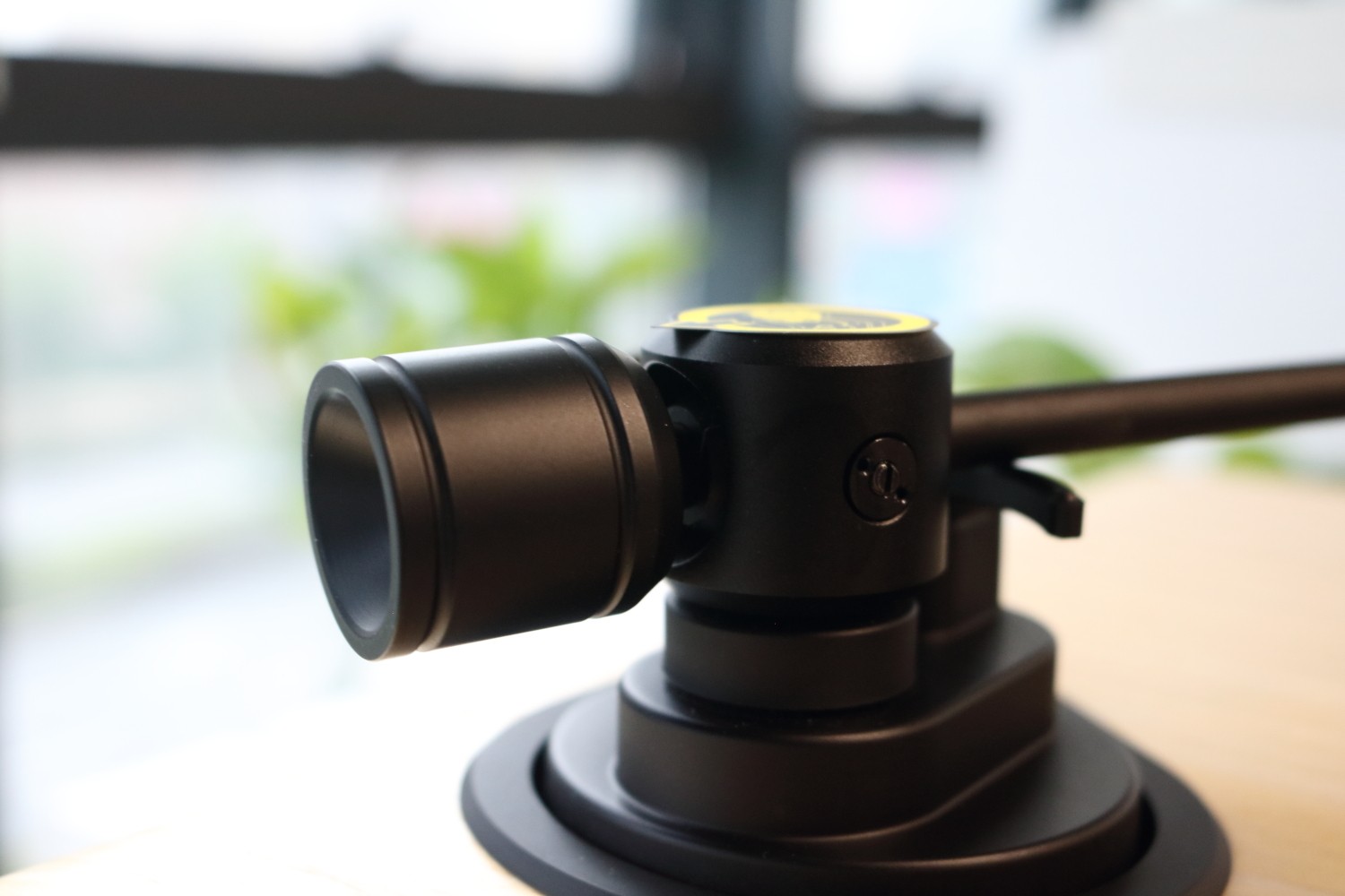 在唱臂转轴的后方有一个螺孔,是用来加装配重块的,