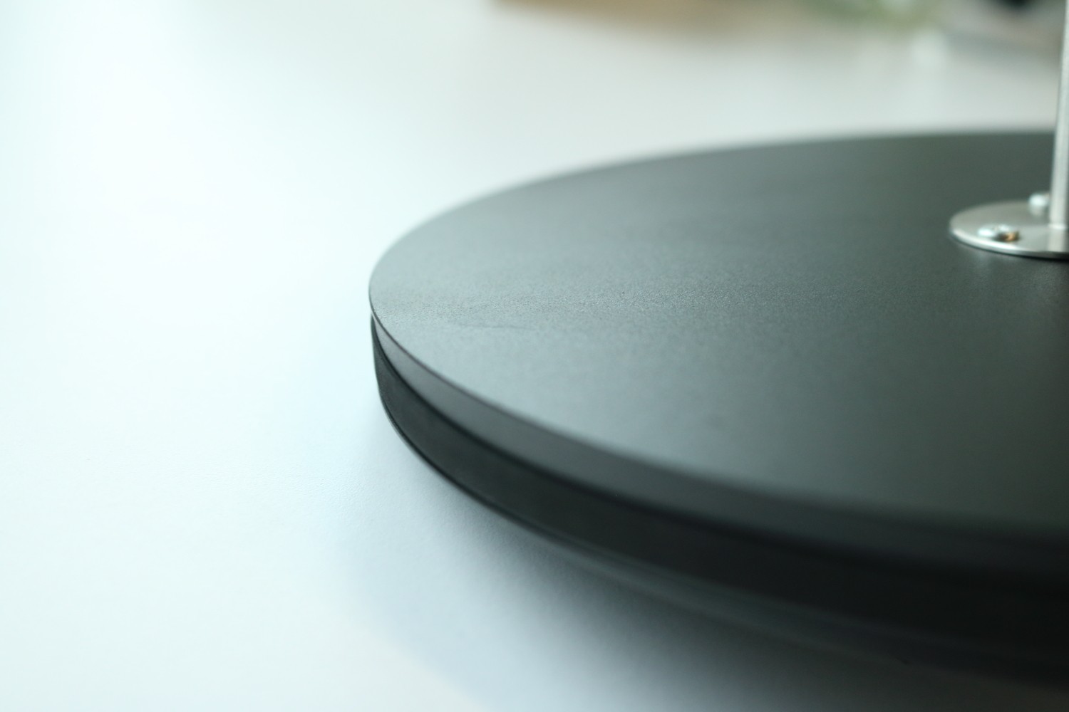 而在转盘上面则是有一张橡胶垫,类似鼠标垫的材质,可以防止唱片和转盘直接接触,导致金属转盘划伤唱片,同时也可以增大唱片和转盘之间的摩擦力。