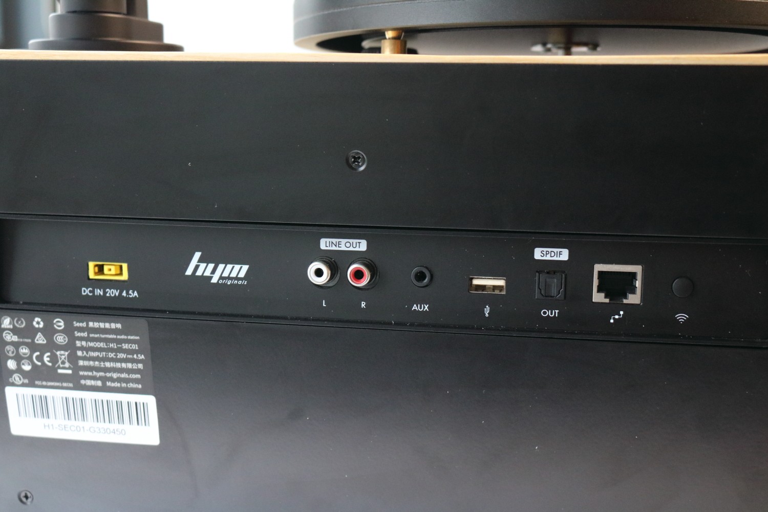 嘿呦Seed的接口包括一个方形电源接口(属于低电压大电流)。一对Line Out声卡音频输出接口(连接外置音箱使用)。一个AUX音频输入接口(连接HIFI播放器或者功能等音源输入设备)。一个USB 3.0接口。一个Spdif Out两针同轴数字音频光纤输出接口。还有一个WLAN有线网络接口,还有一个无线开关。