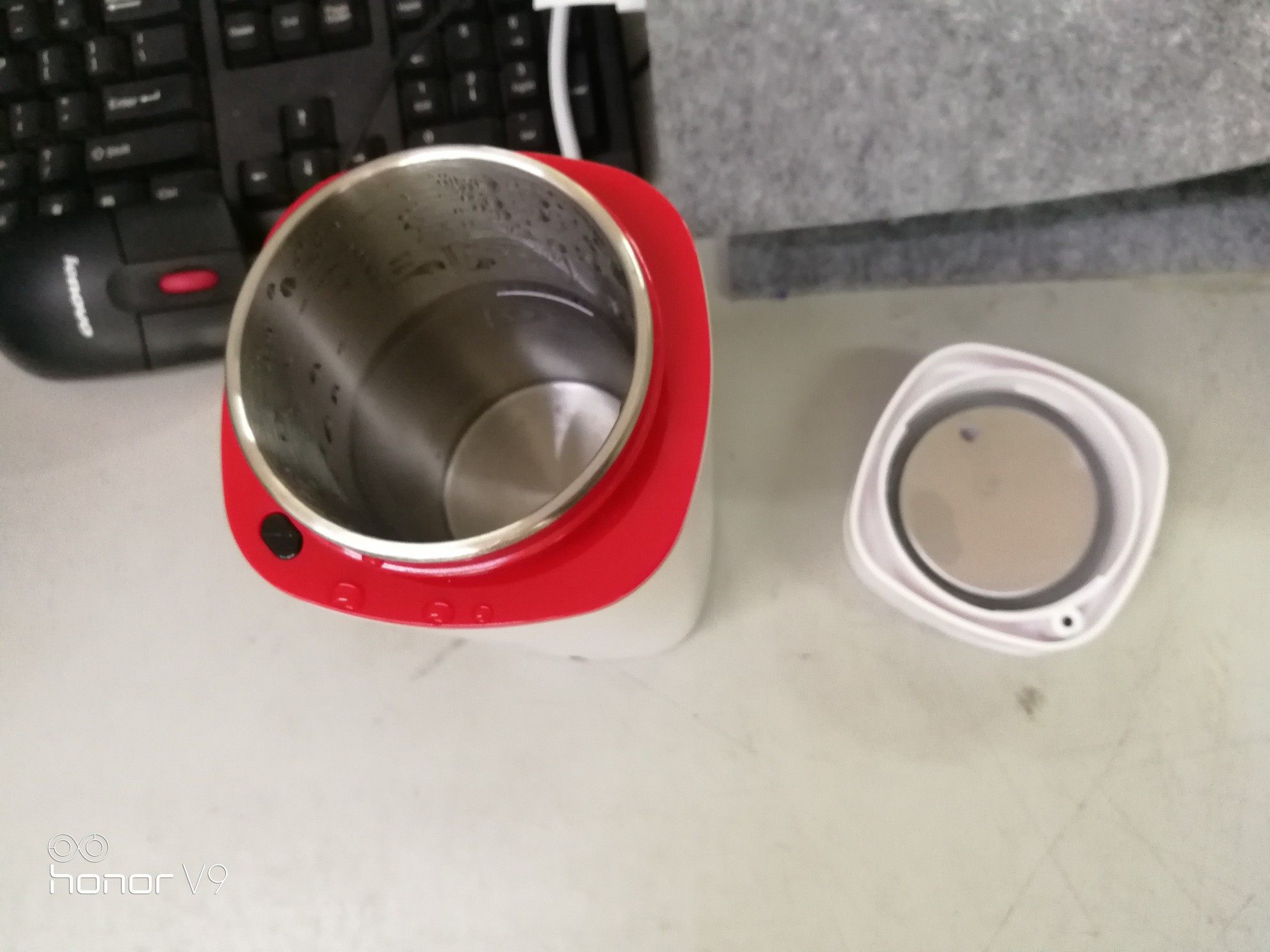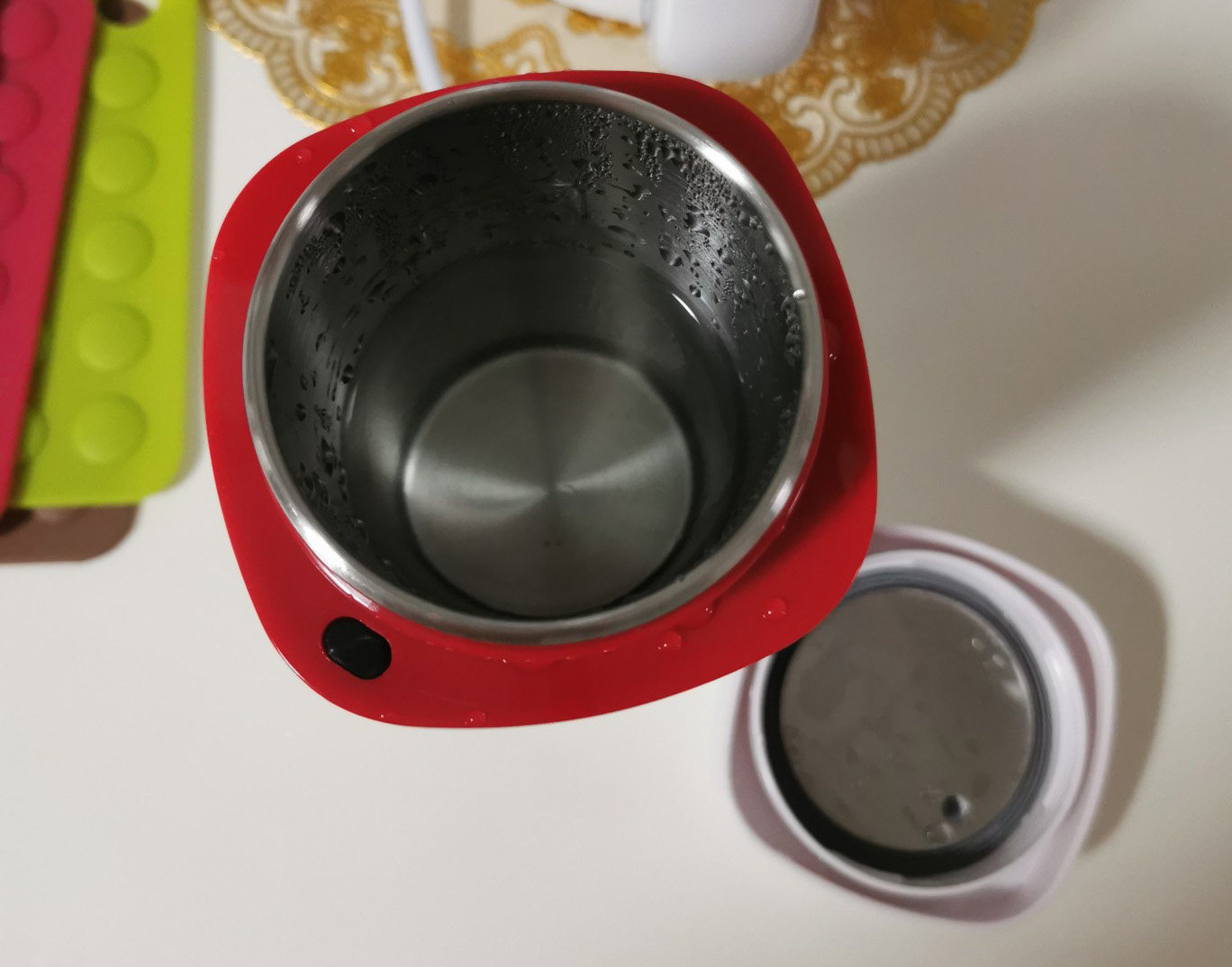 由于整体是杯型设计,底部会相较于顶部更为纤细些。为了防止重心不稳,底部使用的是防滑隔热底部,能有效的防滑,牢牢的固定在桌面。