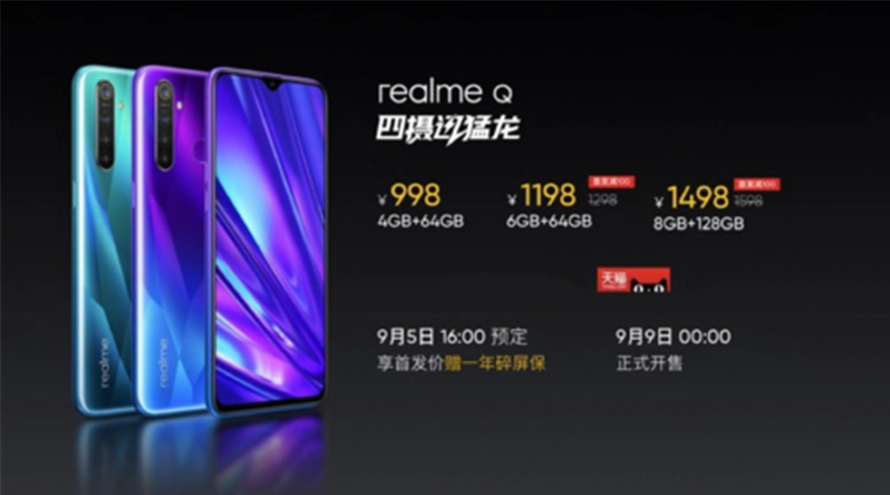这样的一款千元价位的新标杆,realme Q4+64GB版本售价998元,6+64GB首销价1198元,8+128GB首销价1498元,即日起在天猫官方旗舰店开启预约,9月9日0点正式开售。