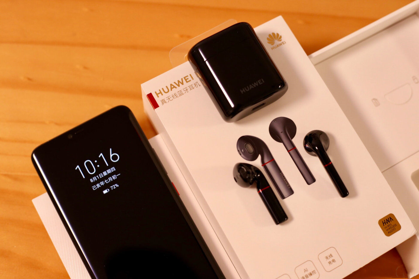 这款华为真无线耳机采用亮黑色的配色方案,耳机主体类似于苹果AirPods不过耳机底部采用银色设计。