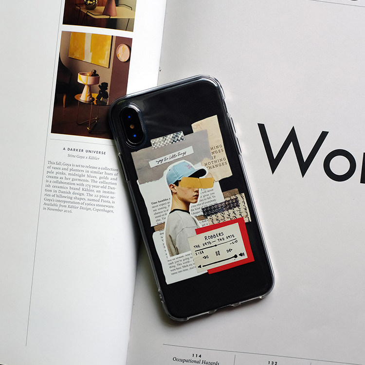 主打意境的样式, 复古拼贴设计,将透明手机壳加入进去,款式相当有个性,而且还非常有趣味,比较适合男生使用。