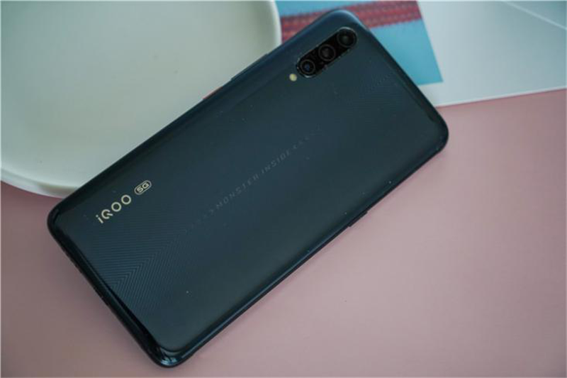 iQOO Pro机身背面依旧拥有能发光的“MONSTER INSIDE”字样,相比起iQOO手机的变化,只是在“iQOO”标志的旁边新增了“5G”标志,且纹理更换为带“V”型的极速光轨纹理,不仅更加好看,也更能体现iQOO Pro的极速质感。