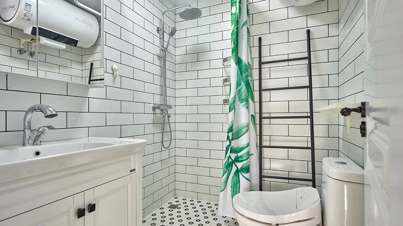 卫生间墙壁上采用了白色的文化砖装饰,在灯光的映衬下,让卫生间显得更加敞亮大气。卫生间没有安装淋浴房,而是采用这种带有绿植图案的帘布隔开,既不影响室内的空间感,同时也能起到非常好的防水效果,日常打理起来更加便利。在卧室靠墙还摆放了一个简易的置物架,简单大方,能够轻松收纳一些洗浴用品。