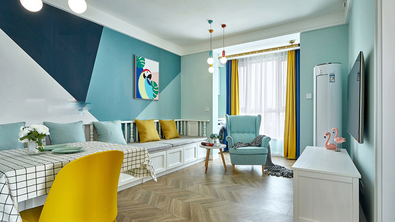 年轻人都喜欢温馨浪漫的生活环境,就像这种小户型,硬装布局简单合理,巧妙融入一些马卡龙色,能够让二人世界更加甜蜜浪漫。餐客厅之间采用开放式的设计,在墙壁上还采用拼色的设计,装饰的简单,让室内活力十足。