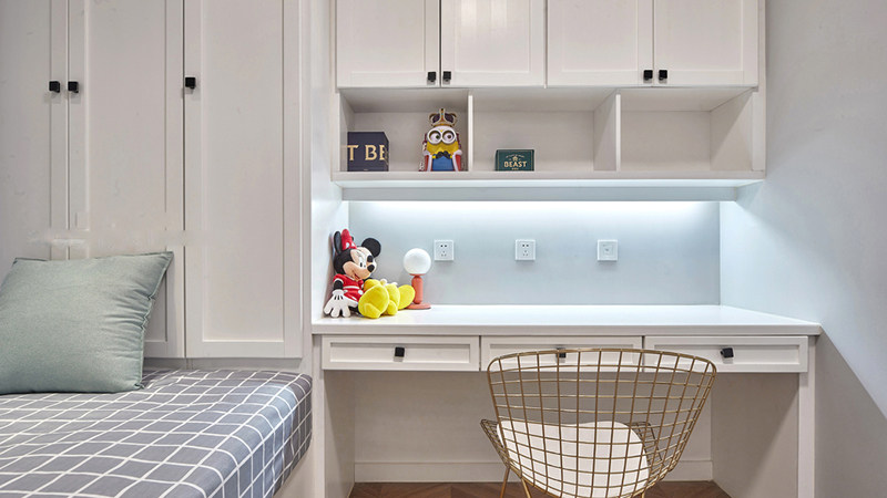 次卧的面积比较小,采用榻榻米的装修方案,这种一体化的设计能够为卧室节省不少的空间,让卧室显得更加敞亮大气。床头柜和书桌吊柜有着丰富的储物空间,能够轻松收纳一些小件物品,能够让室内显得更加整齐大方。书桌与衣柜采用一体化的设计,搭配一把舒适的椅子,日常办公学习更加轻松。