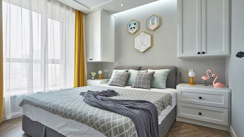 主卧布局非常新颖有创意,在床头两侧还安装了精致的吊柜,既美观又能提供相当好的储物空间,能够轻松收纳一些小件物品,让卧室显得更加整齐有序。高级灰色的大床居中摆放,搭配条纹的被褥,营造出一种轻松舒适的休息环境,也让卧室显得更加文艺有格调。