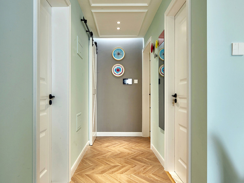 走廊墙壁上采用了浅绿色的格调,在走廊尽头还采用高级灰色的格调,这样使得走廊显得更加清新有层次感。在走廊墙壁上还装饰了一幅大尺寸的壁画,在灯光的映衬下,让走廊显得更加丰富多彩。
