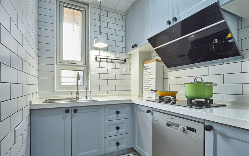 厨房墙壁上采用了白色的文化砖装饰,搭配黑色的缝线,让厨房线条感十足,日常打理起来也更加便利。浅蓝色的橱柜非常精致,呈L型摆放安装,搭配一组吊柜,将厨房的空间非常好的使用了起来,能够在有限的空间里提供相当好的储物能力,将零散的厨具整齐的收纳起来,日常做饭拿取更加便利。