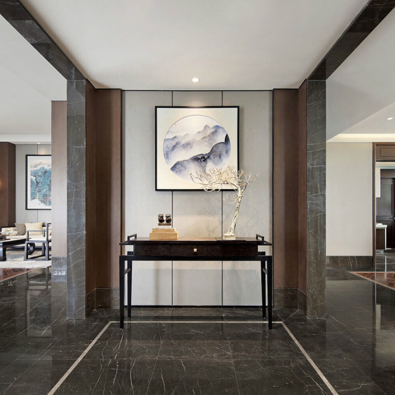新中式风格不是纯粹的传统文化元素的假单叠加,而是通过对传统文化的认识,注入中式的风雅意境,从而使空间散发清雅含蓄、端庄典雅。客厅除了保留中式的韵味外,还加了大理石、玻璃、灯带、等现代材料,使空间又包含了现代生活气息;光源上舍弃了以往的烛光环境,使用简洁几何灯具,在家具搭配上主要取材与自然,以木材为主,在合适的地方用合适的材料。