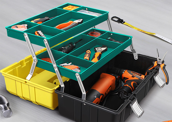 其次还有专用的铁质的阶梯式工具箱,就如同我们上学时期用过的双层铅笔盒一样,打开后内部呈阶梯形状,将工具收纳在其中即可,这种方法也可行,毕竟市面上也有很多工匠师傅采用的这一种收纳方式。但这种方式的收纳一般是维修工所使用的,为的是能方便携带。