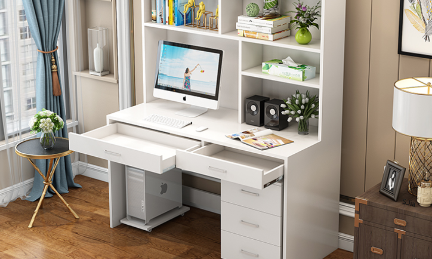 这款书桌具有多格置物书架,分隔分类,收纳起来也便捷,桌面经过加宽设计,看起来大方,用起来也是大方,小巧的抽屉设计,可以放置私人物品,金属拉手看起来光泽靓丽,可以说非常适合放在儿童房中。
