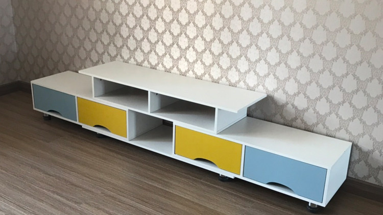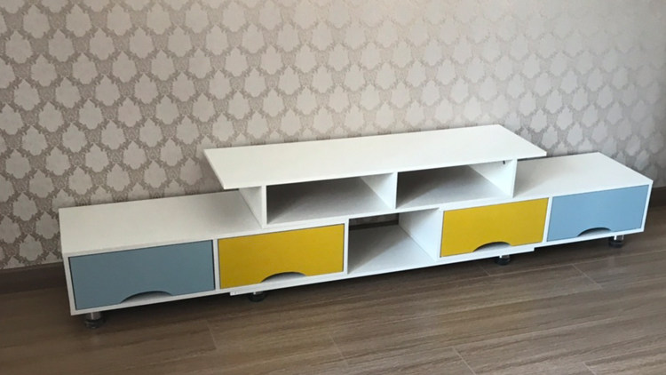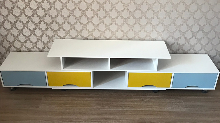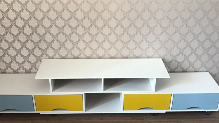 这个电视柜外表看起来方方正正,视觉上不凌乱。配色不容易过时,而且给整个客厅添一点跳跃的颜色,客厅看起来也没那么单调了。