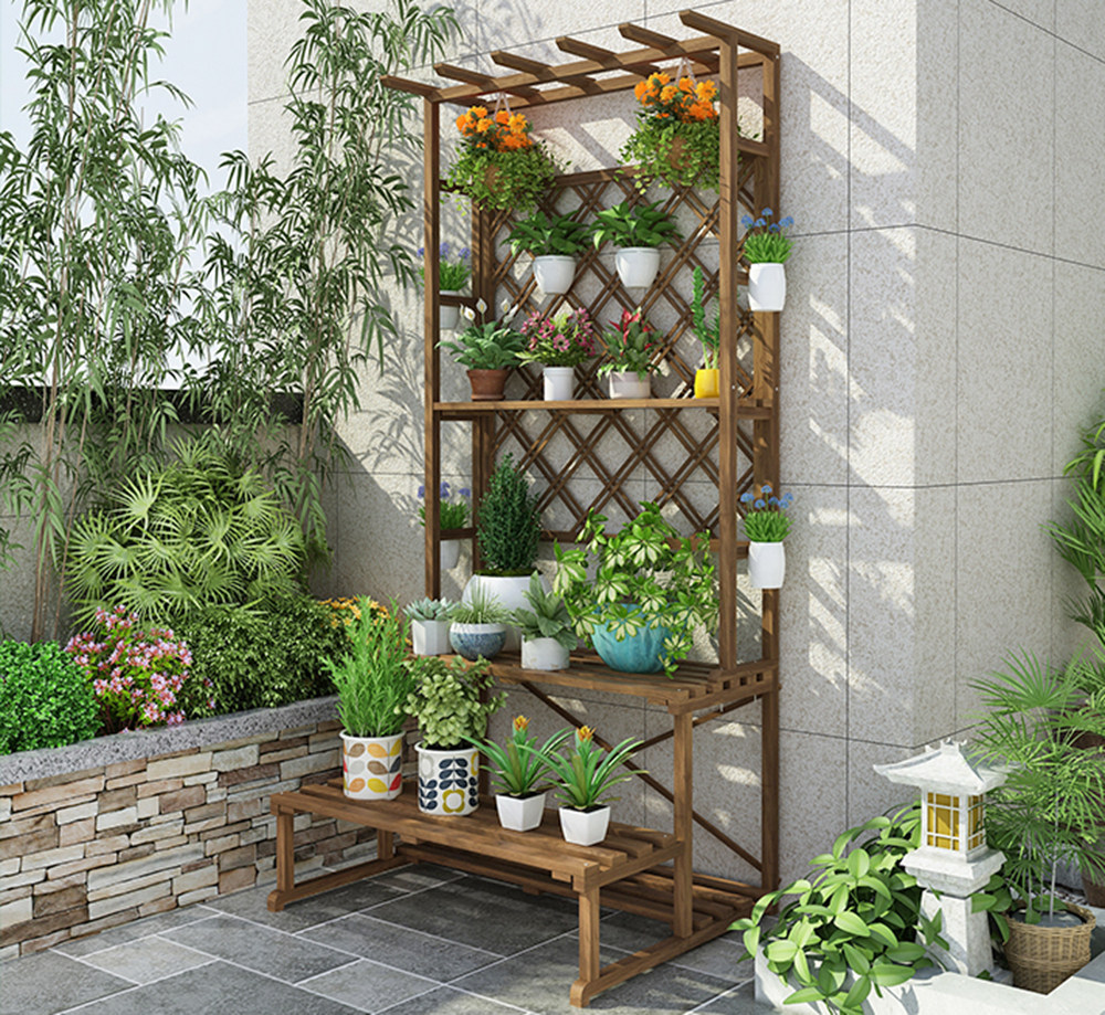 接下来介绍的这款防腐的阳台花架,容量非常大,可以装下不少的花盆,它的最突出特点就是它的承重量非常大!首先,双条纹网格比一般的网格更加坚固,其次,顶端木条加到了38公分,悬挂更加稳固,承重量大,侧面还可以悬挂较重的花盆,提高稳固,使用起来非常地安全,放在阳台很合适!