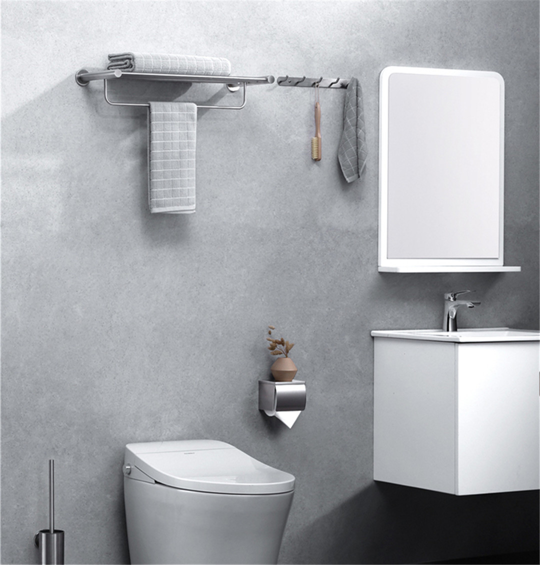 浴室内由于环境较为密闭,通风效果不佳,就需要对常用的毛巾进行晾晒,以免细菌滋生。悍高的这款五金挂件套装包含2个毛巾挂架、1个纸巾筒、1个马桶刷,都是非常实用的产品,一次购买基本就能满足卫浴间洗漱的要求,免得频繁购买。
