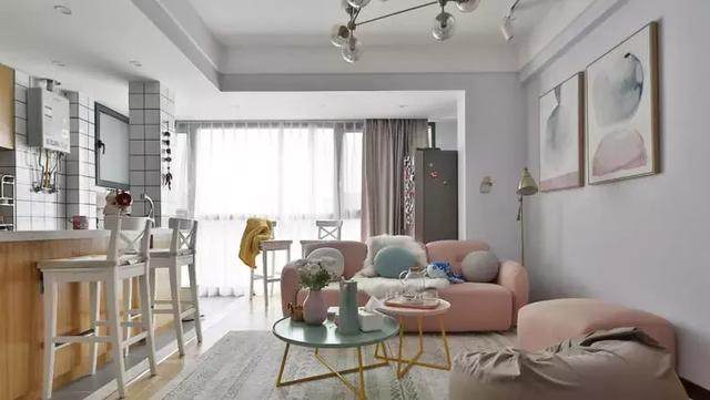 粉色沙发搭配上马卡龙色组合茶几,不仅清新自然,而且十分温馨,同时空间感也超强。