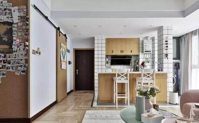 一进门,就能感受到来自家的温暖,浅色调营造出简约舒适的空间,玄关处并没有什么设计,右手边是木质谷仓门,左手边则是开放式厨房。