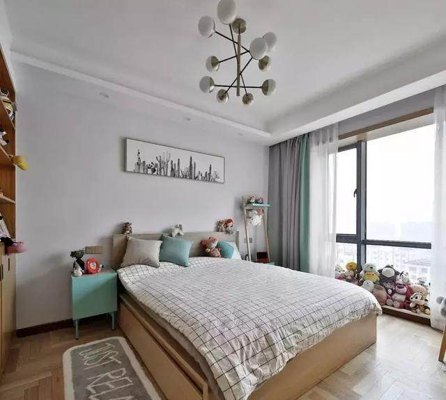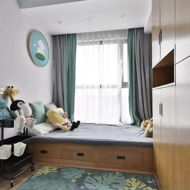 儿童房围绕着窗前空间,定制了一个原木榻榻米,地面和墙面空间变成收纳,又能满足睡眠需求,真是一举多得,难怪人人都说榻榻米和小户型是绝配呢。