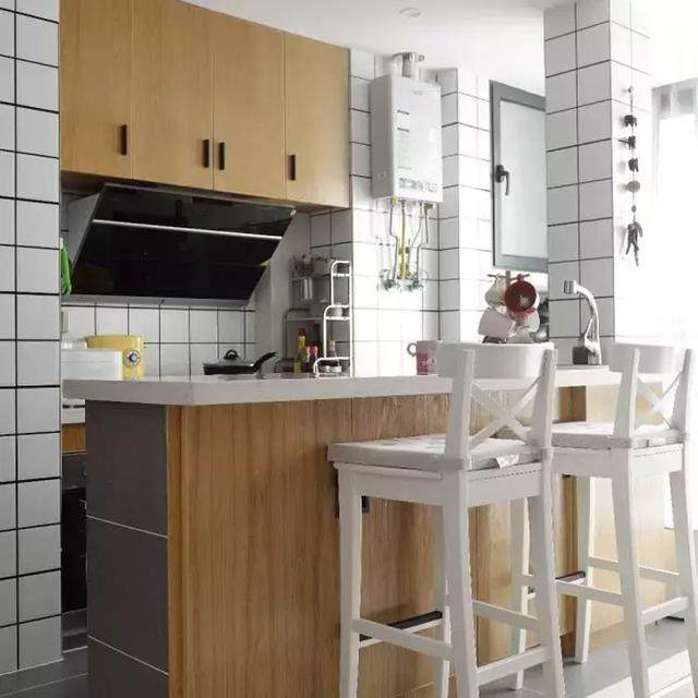 厨房整体选用白色小方砖,看上去十分洁净,同时显得更加时尚;原木橱柜搭配上白色台面,整体自然简约。