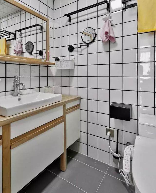 卫浴间同样选择白色小方砖,整个空间都充满了时尚感,木质浴室柜清新简约,让卫浴间变得更加舒适。